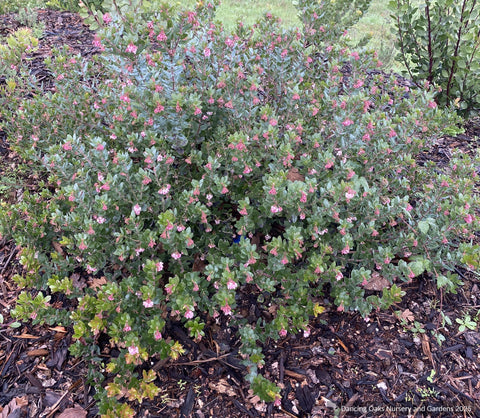 One of the most beautiful in form and flower, 'Myrtle Wolf' is compact with particularly numerous bright pink flowers. New foliage turns flaming red-orange and chartreuse in the fall, then becomes blue-grey when mature. Native to California's Central Coast, South San Francisco Bay Area (Pajaro Hills)—a Chaparral plant.