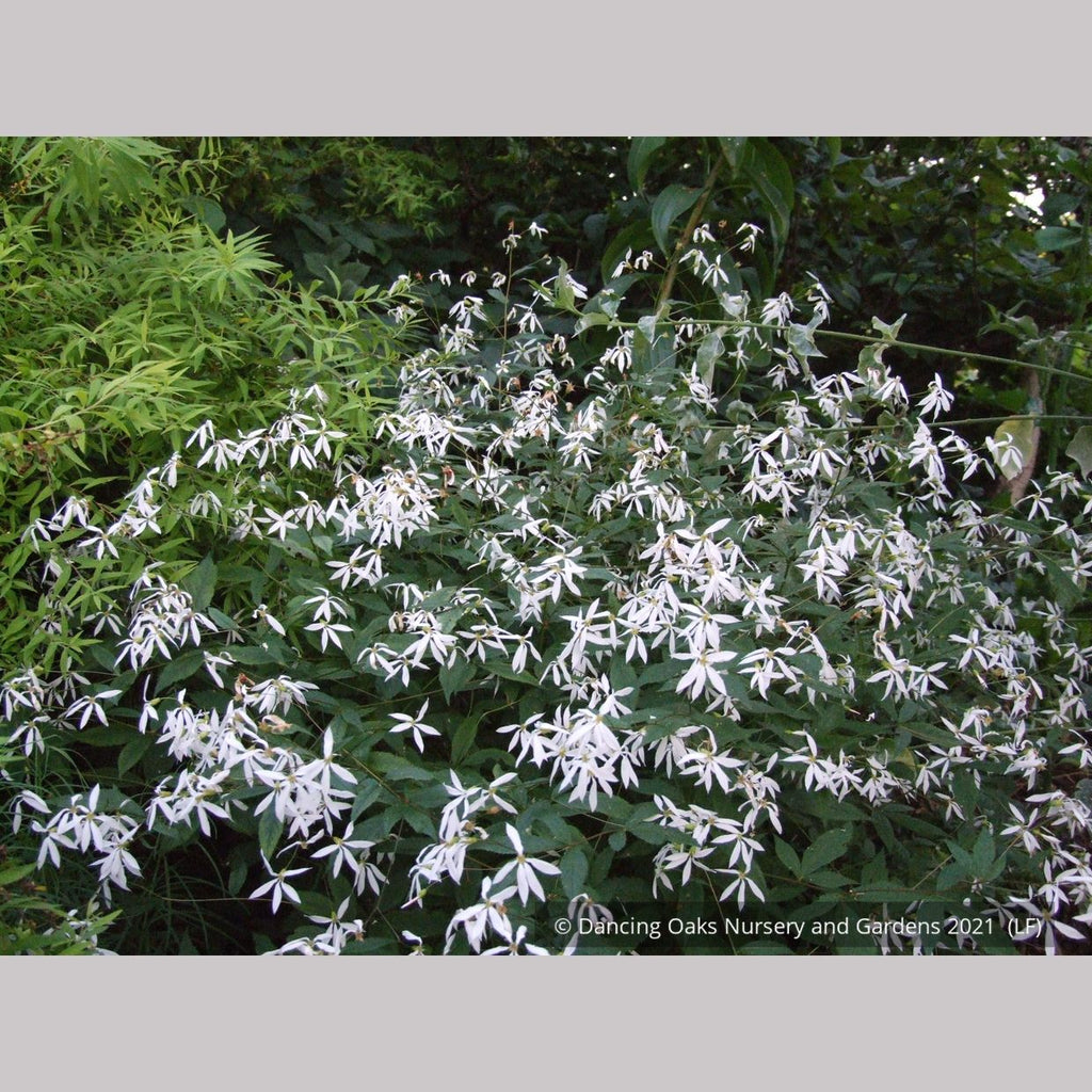 This shrub-like perennial has branched, arching, thin red stems covered with trifoliate leaves made of long, olive-green leaflets. In early summer, light and airy masses of white blooms with showy red calyces effervesce. Autumn finds it ablaze in oranges and yellows. A North American native, best with summer water and bright shade, it will attract butterflies but usually not deer.