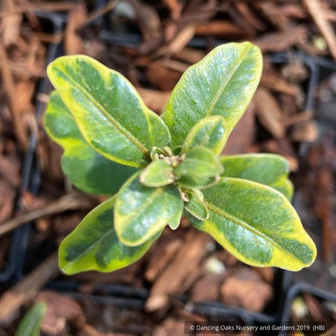 Evergreen shrub; mature size: to 7 ft T x W in 10 years, or prune to preferred size/shape.