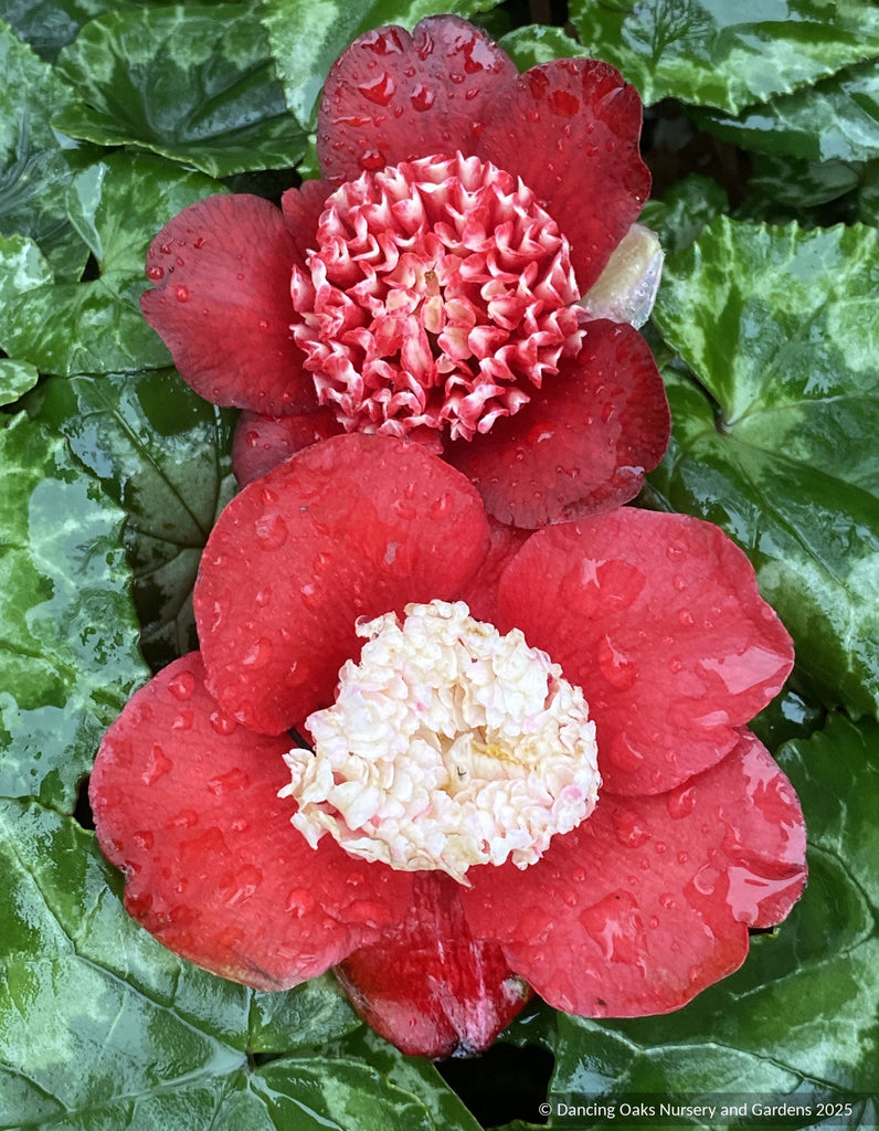 Large, deep red petals surrounding a smaller white center, reminiscent of an anemone flower. For many a Camellia collector, this is the one that started it all.