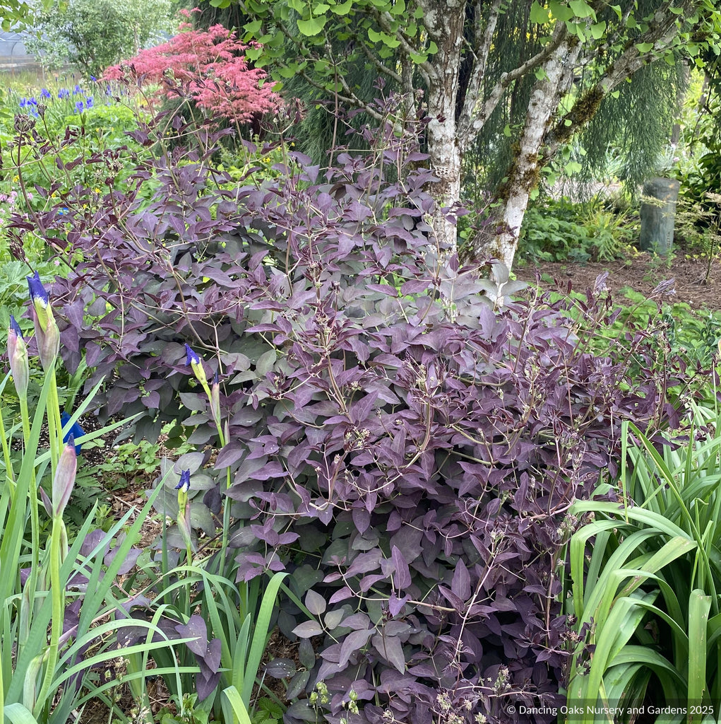 Fresh spring foliage emerges in shades of dramatic dark plum. This extra dark selection was introduced by Edelweiss Perennials. The leaves are gradually suffused with dark olive green while retaining a purple cast. Darker coloring persists in plants located in full sun. Beautifully contrasting clouds of small white flowers bloom at the ends of the foliage. For repeat bloom, cut the foliage to the ground once the first flush of flowers is spent, and provide supplemental water.