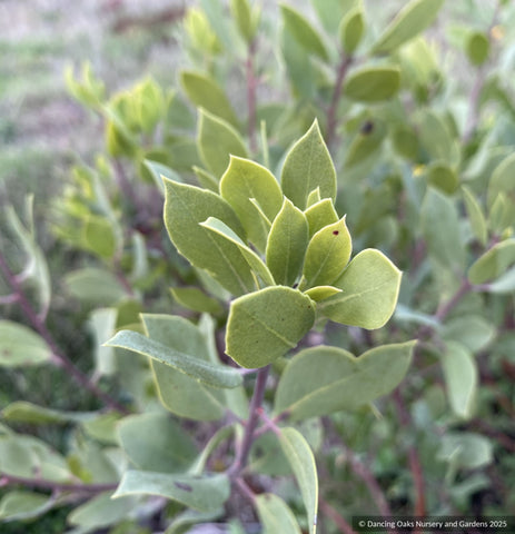 A handsome compact manzanita with subdued tones, the foliage is soft yellow-green, and new growth stems are mauve.