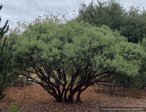 Striking with mahogany branches with glossy winter bark and dramatic ribbons in summer. Extremely hardy, this manzanita can even survive a fire or other damage as it will resprout from its basal burl. Winter blooms of pink-blushed white urn-shaped blooms cluster with grey-green, pointed foliage.