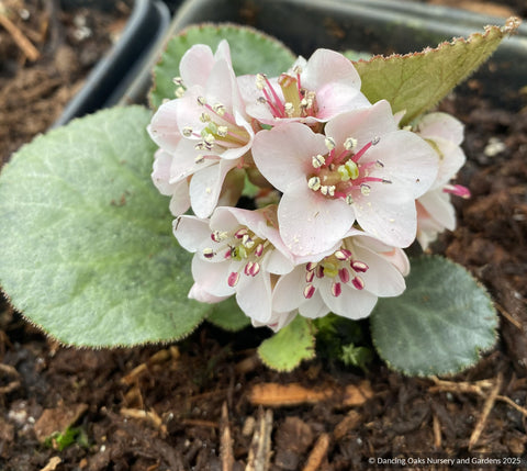 One of the most impressive Bergenia with HUGE (12-in diameter) rounded, supple leaves with a furry surface ("ciliata") surround short red stalks with clusters of soft pink flowers, each containing a spritz of beautifully protruding white-anthered red stamens — a distinctive feature of this flower. Mid-spring bloom.
