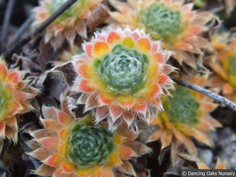 Mat-forming gray-green basal rosettes spreading by red stolons give rise to a cloud of small pink flowers atop long stems in August — a good rock garden candidate desirous of well-drained, lean, gritty soil. It has low water requirements after becoming established, but not a true DRY garden groundcover. The geometric spiral rosettes are a case study for the Golden Section.
