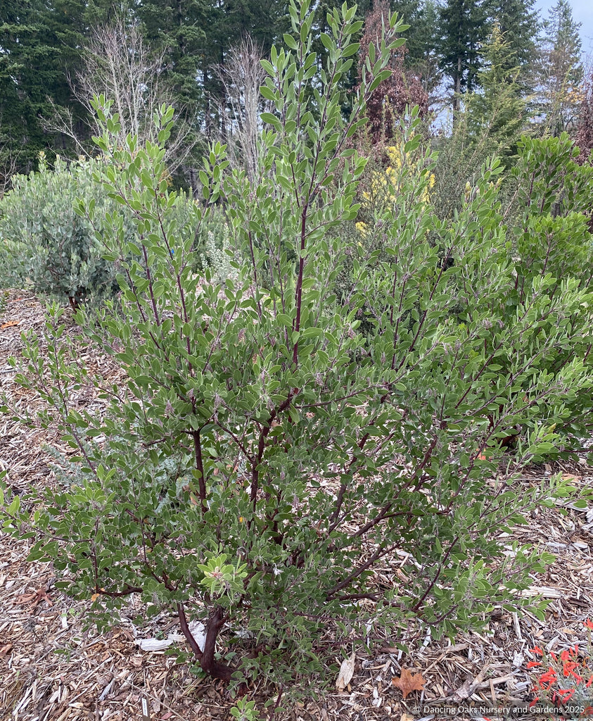 'Baby Bear' is believed to be a hybrid seedling between Arctostaphylos bakeri ssp. bakeri and Arctostaphylos densiflora 'Sentinel'. Bert Wilson from Las Pilitas Nursery selected it as an improvement over 'Sentinel' with larger pink flowers. Dark stems with small, narrow, deep green foliage.