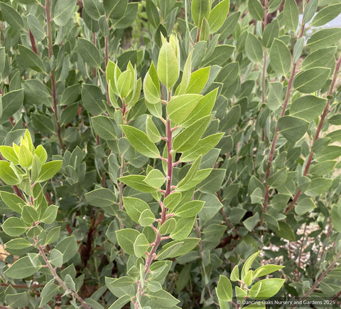 Selected by the good folks of California Flora Nursery from the steep slopes above Lake Sonoma.  The silver cast of the foliage made this selection an eye-catching specimen among the greener leaves of its companions.  'Warm Springs' has turned out to be a vigorous grower with blushed-white winter blossoms followed by decorative fruit of rosy apple-green.  We especially love the captivating plumy hues of the smooth bark.  Take advantage of the large stature of this selection by choosing a site with plenty of room in full sun.  Provides an important early spring source of nectar for hummingbirds and bumble bees.  Very drought tolerant once established.