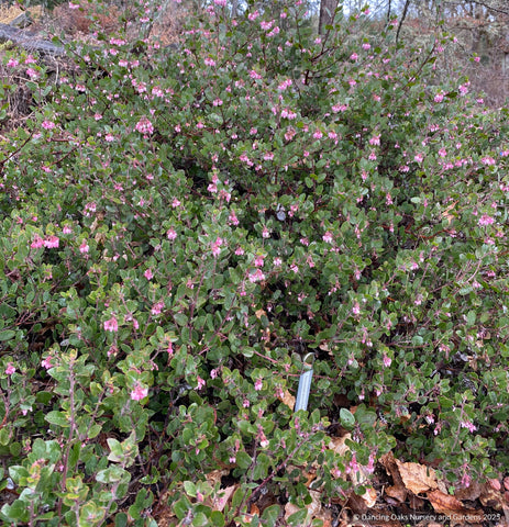 A species or hybrid collected from Rancho Santa Ana Botanical Garden, but of unknown origin. A beauty with small, green leaves and a compact form. Even though it hasn't yet been graced with a cultivar name, it is proving to be hardy in the PNW and should get more attention. This manzanita maintains a pronounced purple hue throughout the seasons due to its new growth stems. Long blooming, we get buds opening in December and full bloom by late March.