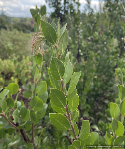 Hybrid between Arct. manzanita and Arct. densiflora with white flowers, green foliage, and upright, gently winding branch structure. Friendlier to garden settings (accepts some summer water) thanks to its densiflora parentage.
