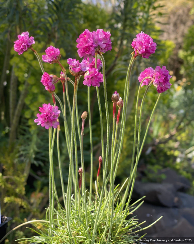Dense rounded tufts of deep-green grass-like foliage sport round lollipop flowers of rose-pink atop a slender stem. Foliage turns bronze in fall. Thrives in poor soil with excellent drainage in full sun.