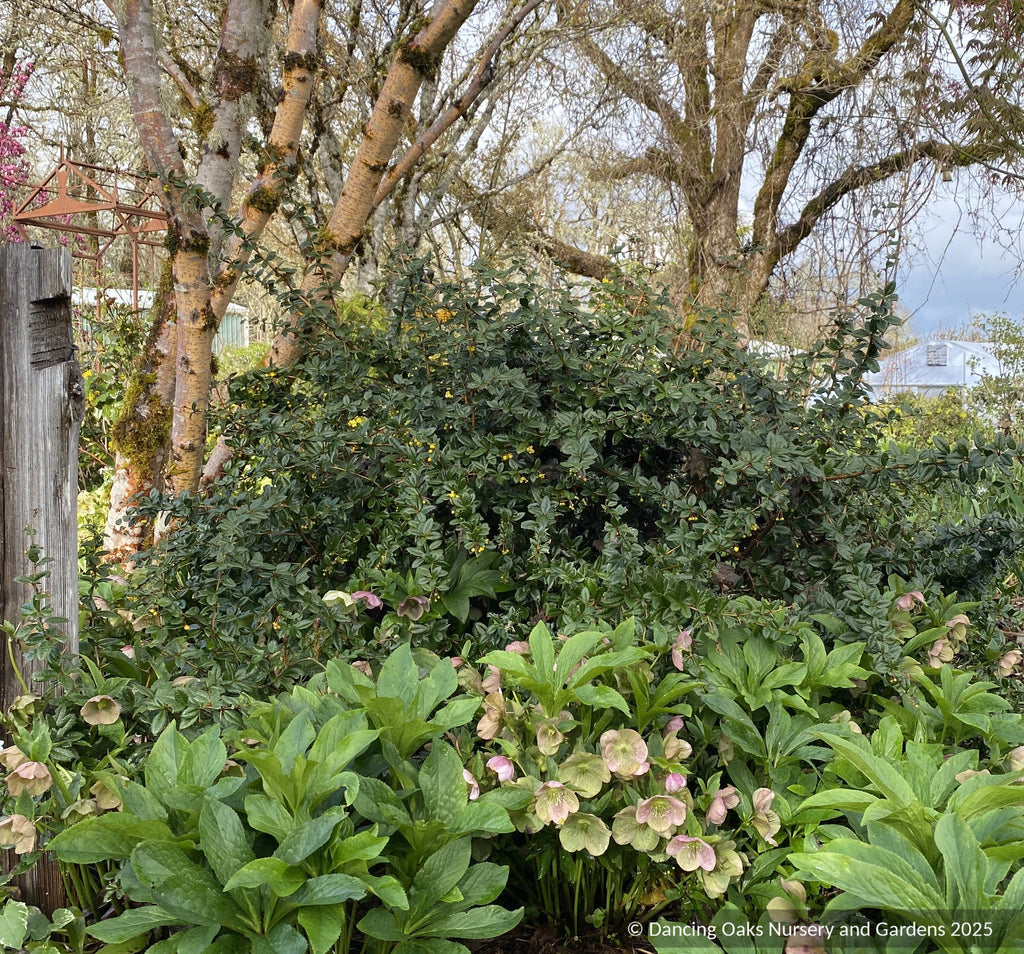 Glossy dark evergreen leaves (inside leaves red in fall) make a handsome dense mounding shrub with long, deterrent thorns. Small bright yellow flowers cover the shrub in spring, and in winter the foliage is plum-purple, more so if in full sun. Fast growing.