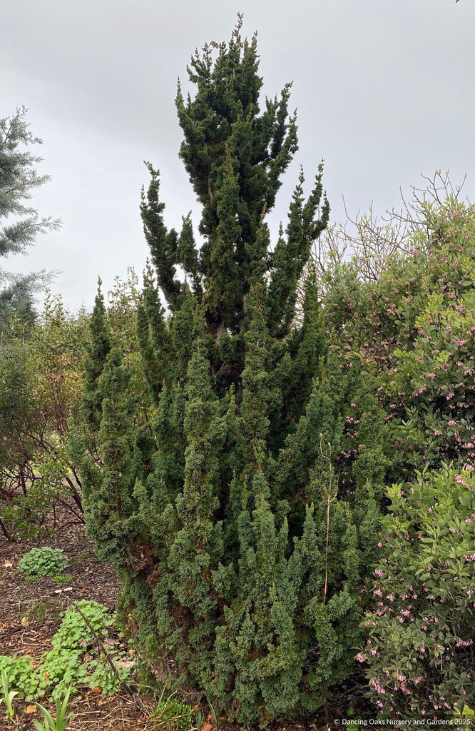 Slow-growing, this sculptural evergreen has extremely congested foliage of deep green on twisting arm-like branches like that of a Saguaro Cactus. Its columnar habit will reach 6 feet in about 10 years. Plant it in a well-drained, full sun site that begs for a focal point or punctuation—a sculptural anthropomorphic form. If you're not watching, it might attempt a pirouette!
