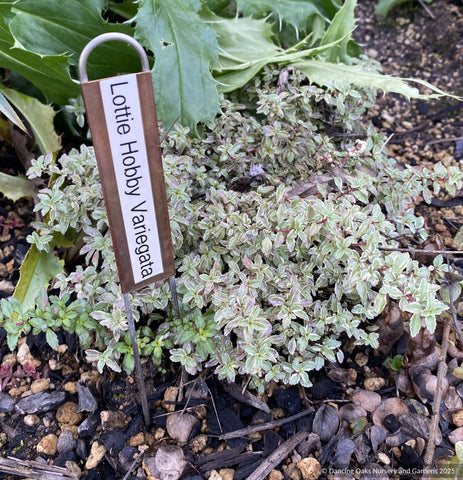 Small, crimped, cream, and soft green oval leaves on red-burgundy stems set the stage for a plethora of small, crimson, tubular flowers. Their flat skirts flare around pretty, protruding white pistils for an utterly charming display. This dense shrub blooms continually, late spring until frost, and needs protection from the hot afternoon sun. Plant deeply.