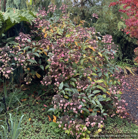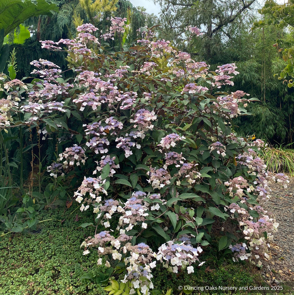 Lace-cap flowers with pink to blue-purple center clusters and lavender-white sterile flowers on the periphery bloom in late summer against this, first-ever, purple-leaved Hydrangea. The leaves, velvety to rough and a little leathery, grow evermore dark purple with rose undersides. Depending upon its location, this large shrub can become any number of wonderfully moody, dusky purples. It even exhibits good fall color before dropping its leaves. We are indebted to Dan Hinkley for the introduction of this Chinese Hydrangea. (I just saw it in our garden nearly covered with honey bees and other small pollinators.)