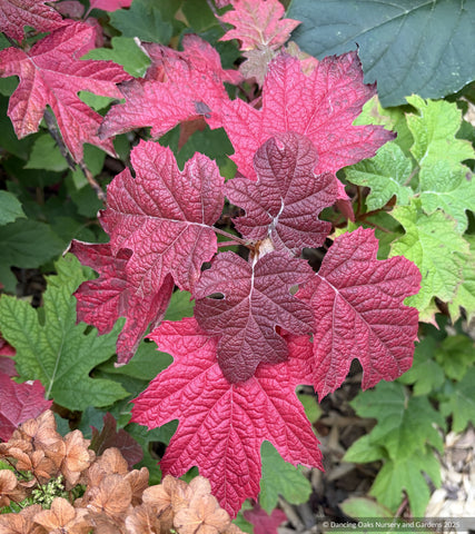 This is a compact and fully branched selection with white summer flowers that age to a rich ruby-red (Dorothy would be so happy.) Its deeply lobed "oak" leaves turn deep reddish-maroon in fall, and peeling bark is an attractive feature in winter.