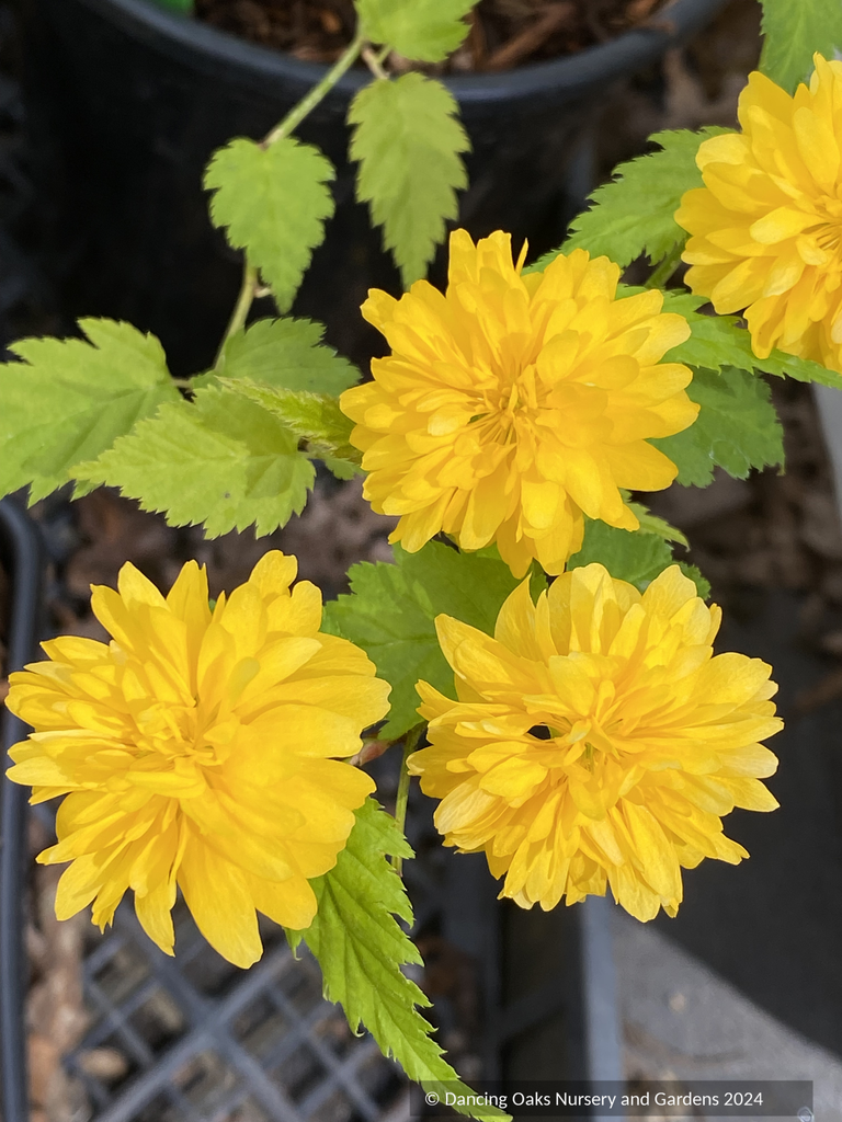 A charmingly old-fashioned deciduous woodland shrub with double-flowered blooms of golden yellow that emerge in early spring on stems of bright green. Arching branches support summer foliage of green that then turns an attractive shade of yellow in the Fall. Appreciates some summer water and humus-rich soil though is tolerant of clay. Can tolerate periods of drought once established.