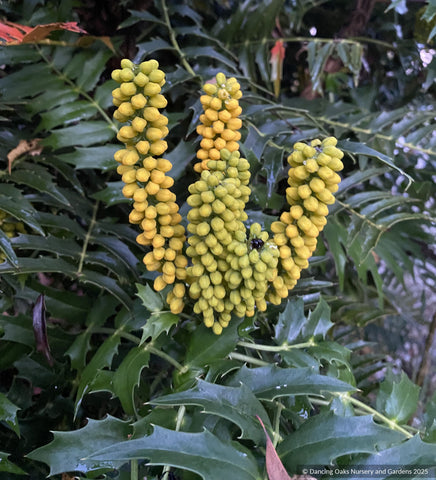 An upright, architectural plant displaying glossy, blue-green leaves with long, spiny leaflets. Skyward, bright yellow flower spikes top stems from late fall into winter.