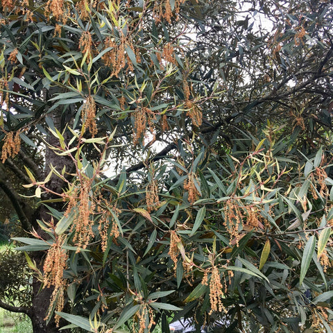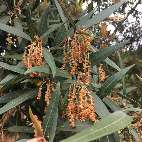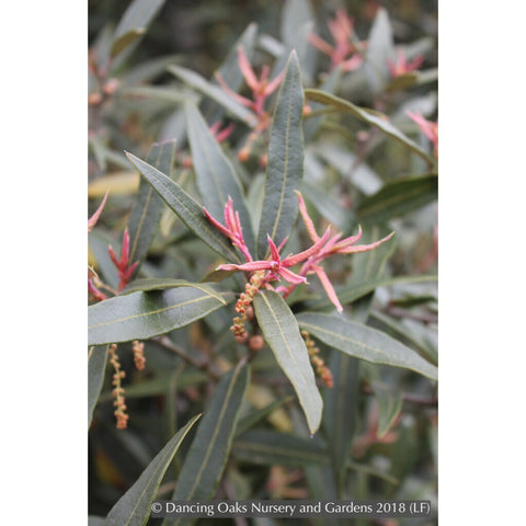 Eventually becoming a tall tree and, with age, rounding out a bit (like many of us), this beautiful and intriguing oak appears silvery as the olive-green surface of its narrow, leathery, lance-shaped leaves visually blends with their white indumentum. From the mountainous SW, it is drought-tolerant and would look terrific with manzanita and other chaparral plantings.