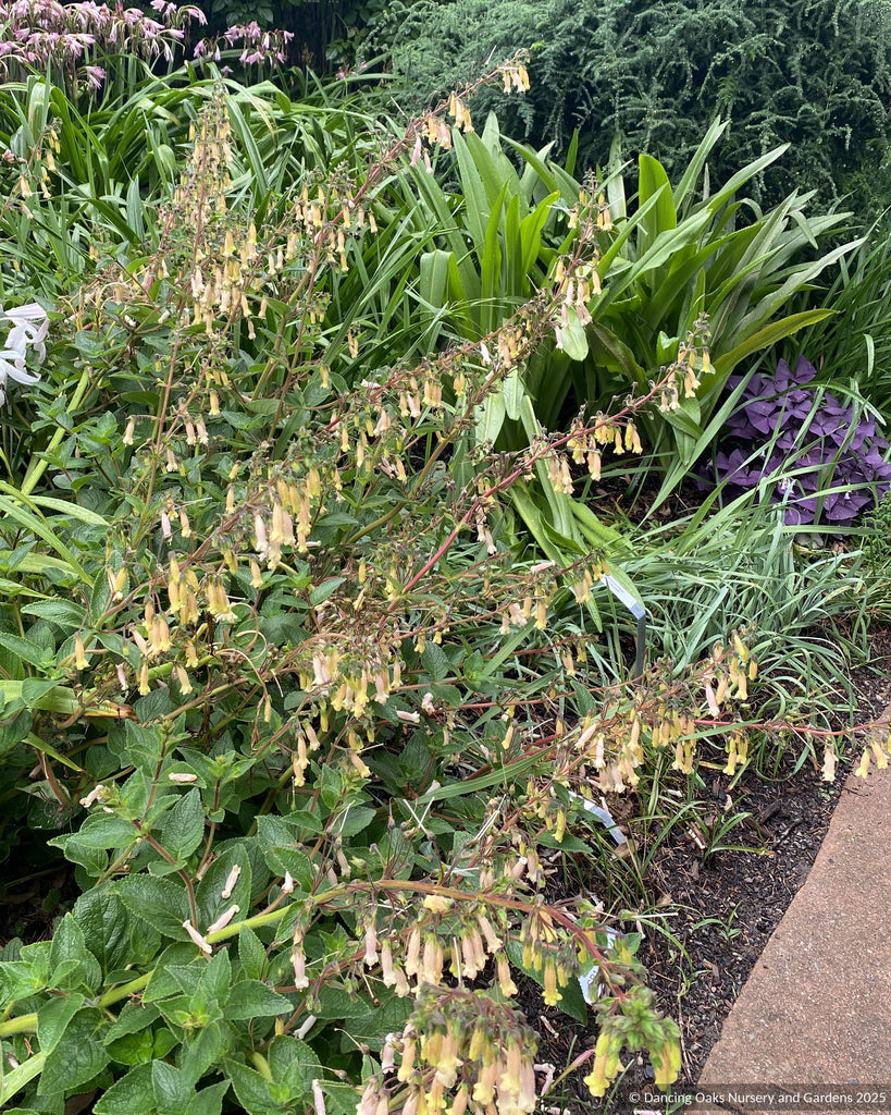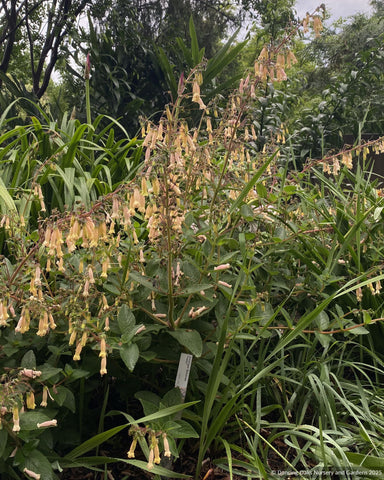 Introduced by Plant Delights Nursery, from seed provided by John Farina, this tuberous perennial has thick leaves and is an excellent candidate for a rock garden. Pale-yellow pendulous flowers dangle from stems of caramel-brown, forming the contrast that gives this delicious variety its name, just like Bananas Foster, yum! Blooms late-spring to fall.